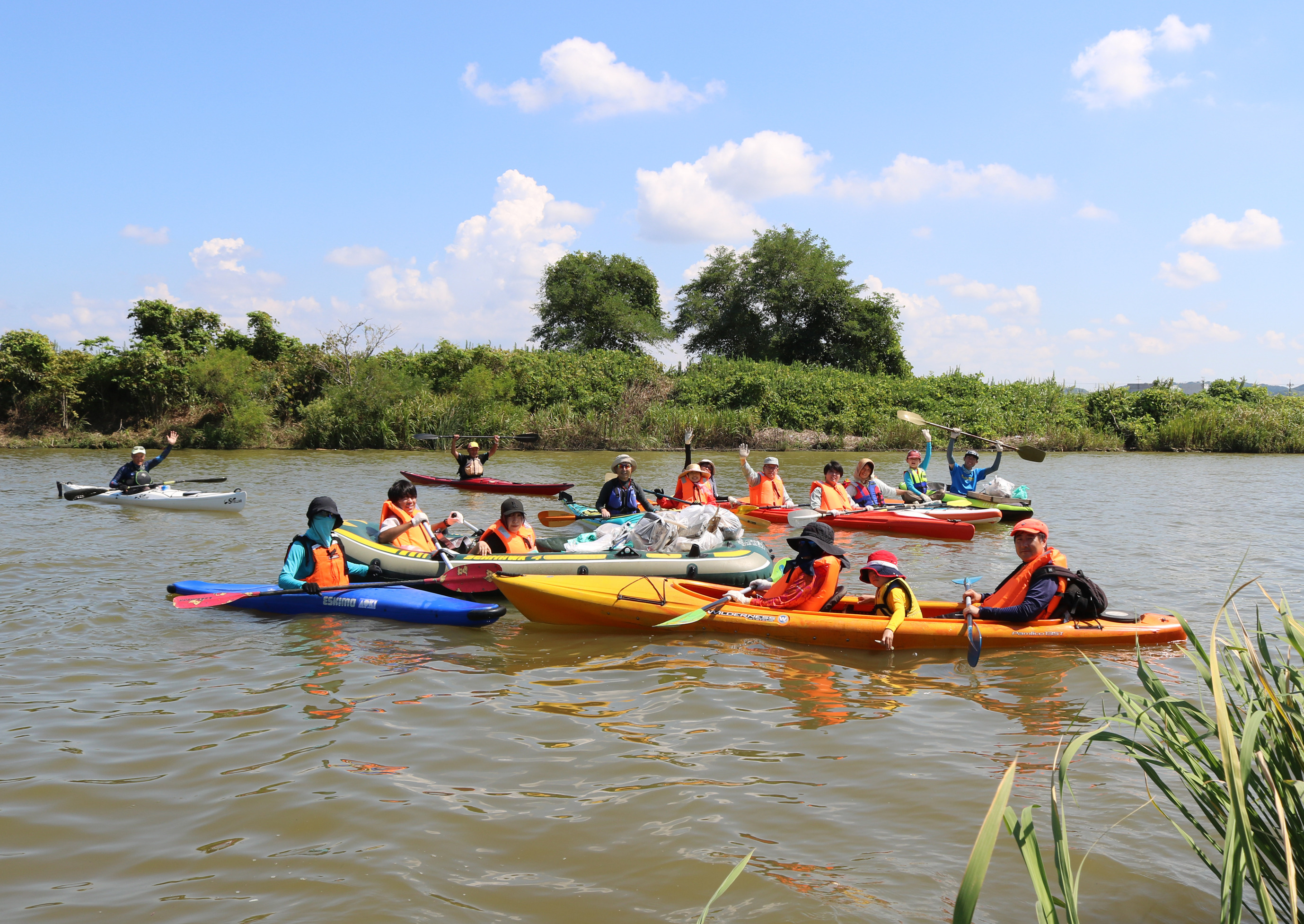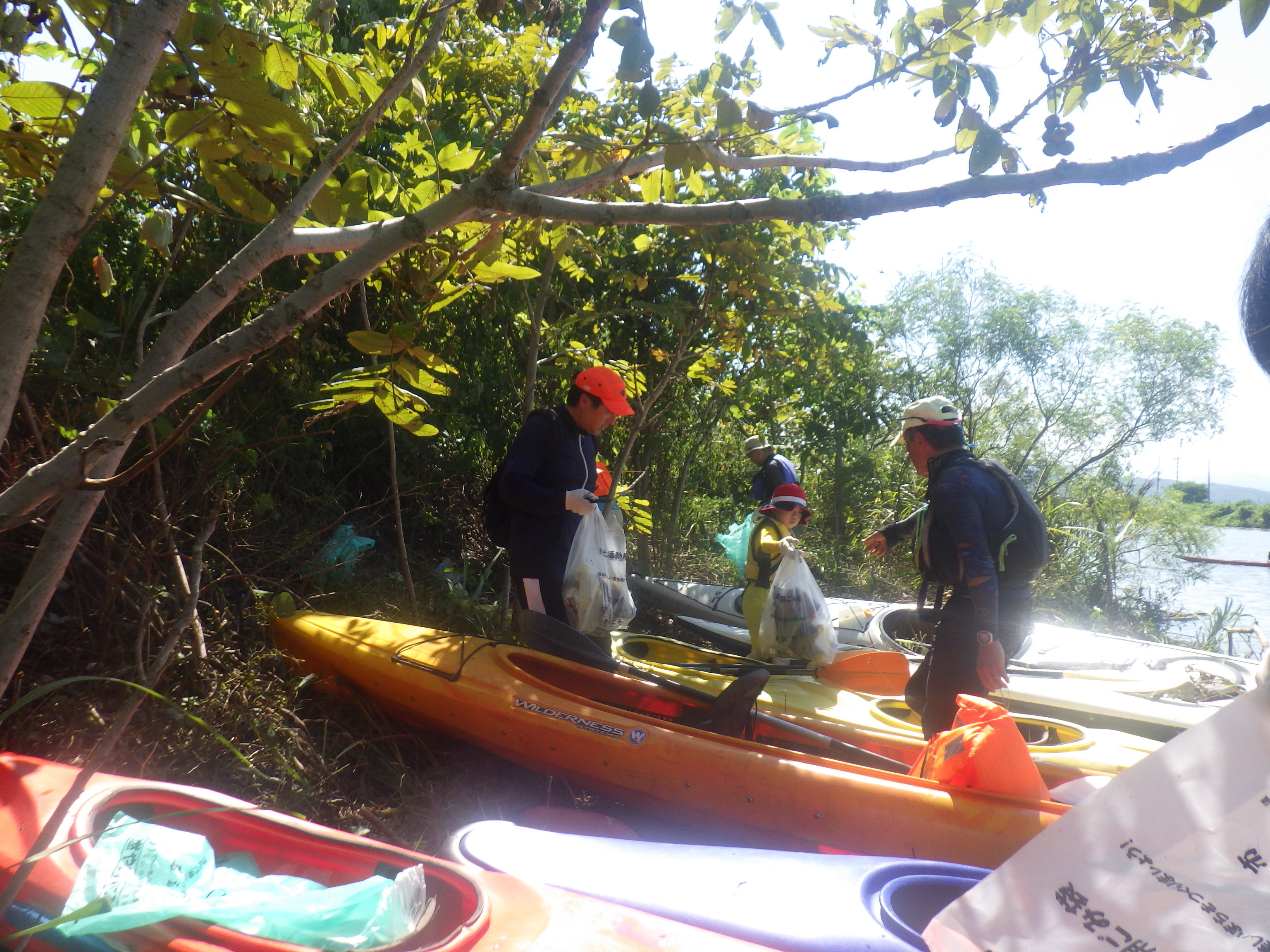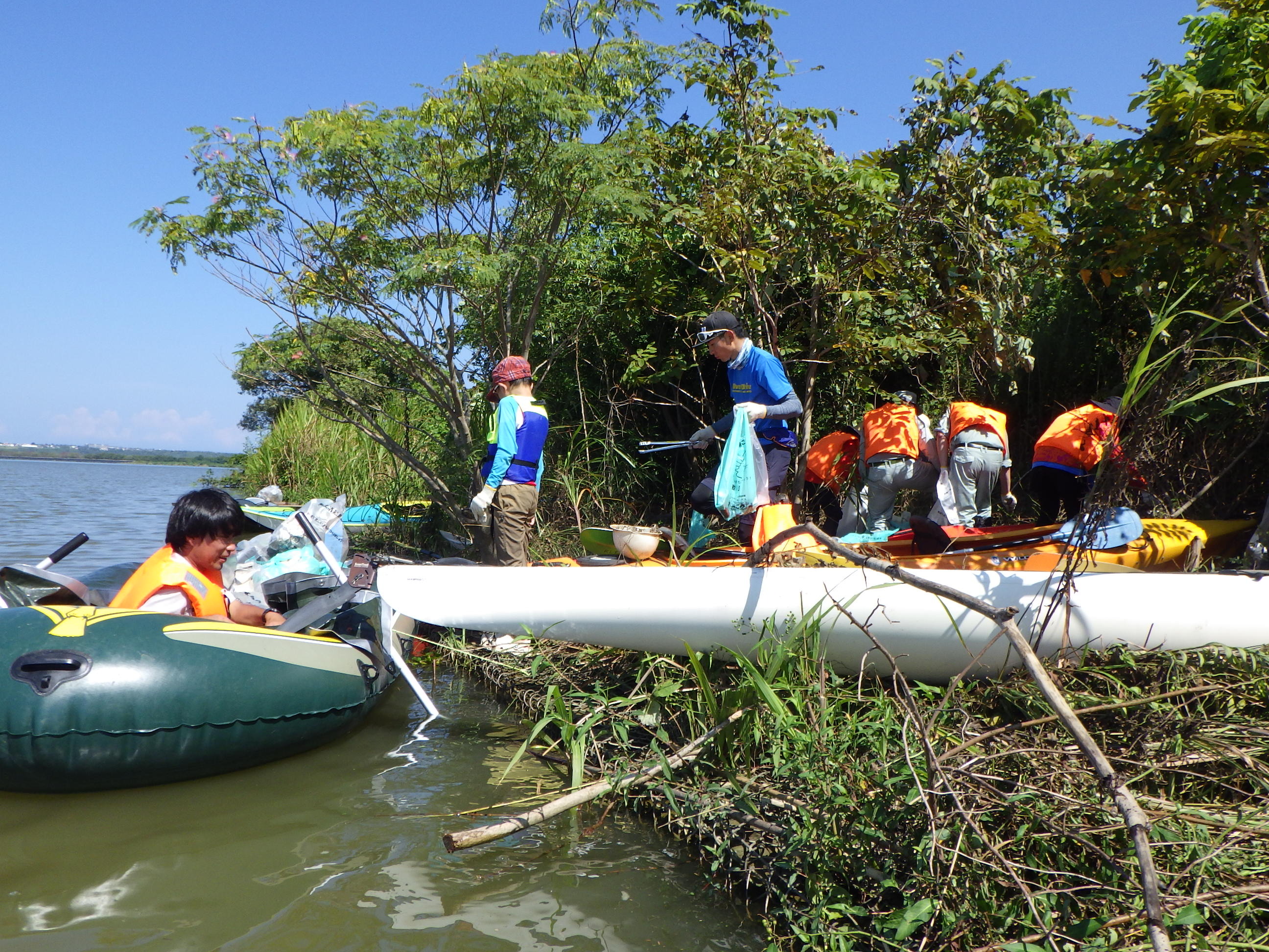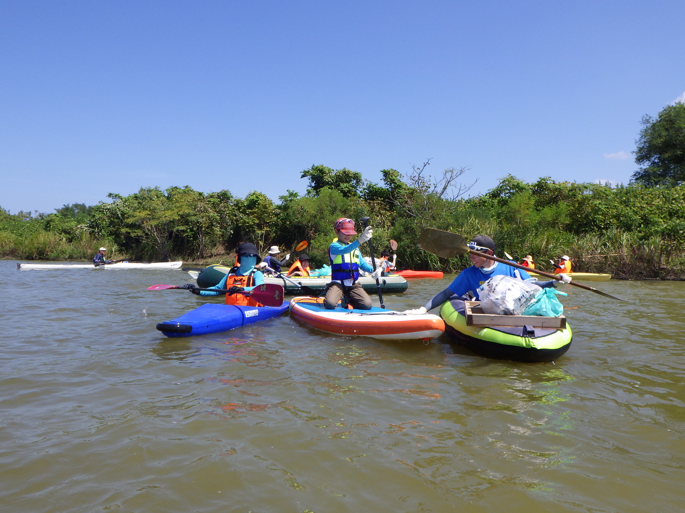 ここは河口に水門があり、流れが無く、ある意味安全になっています。でも小さな子供が川に落ちる危険もあることから救命着を着用いただき実施しました。