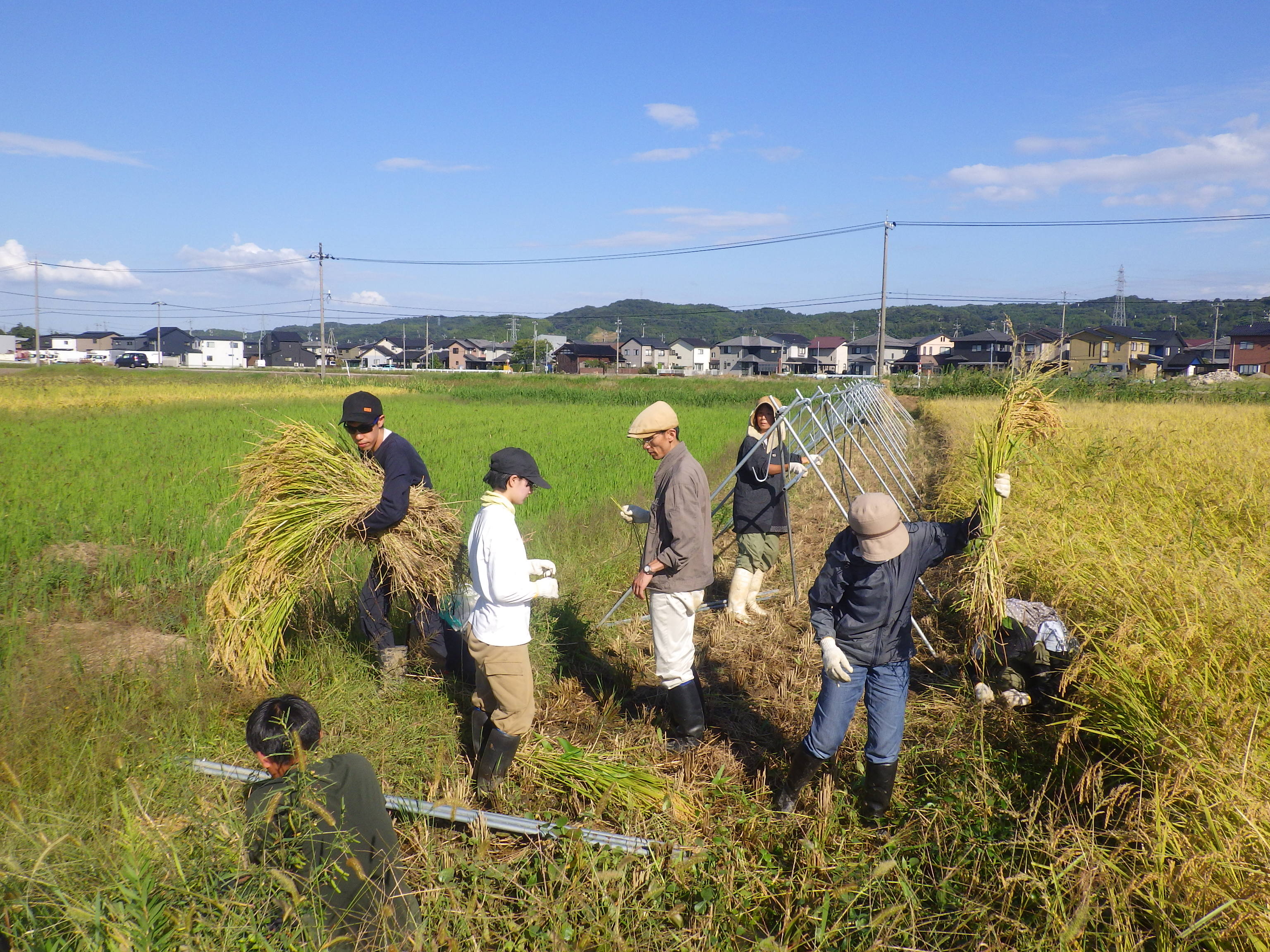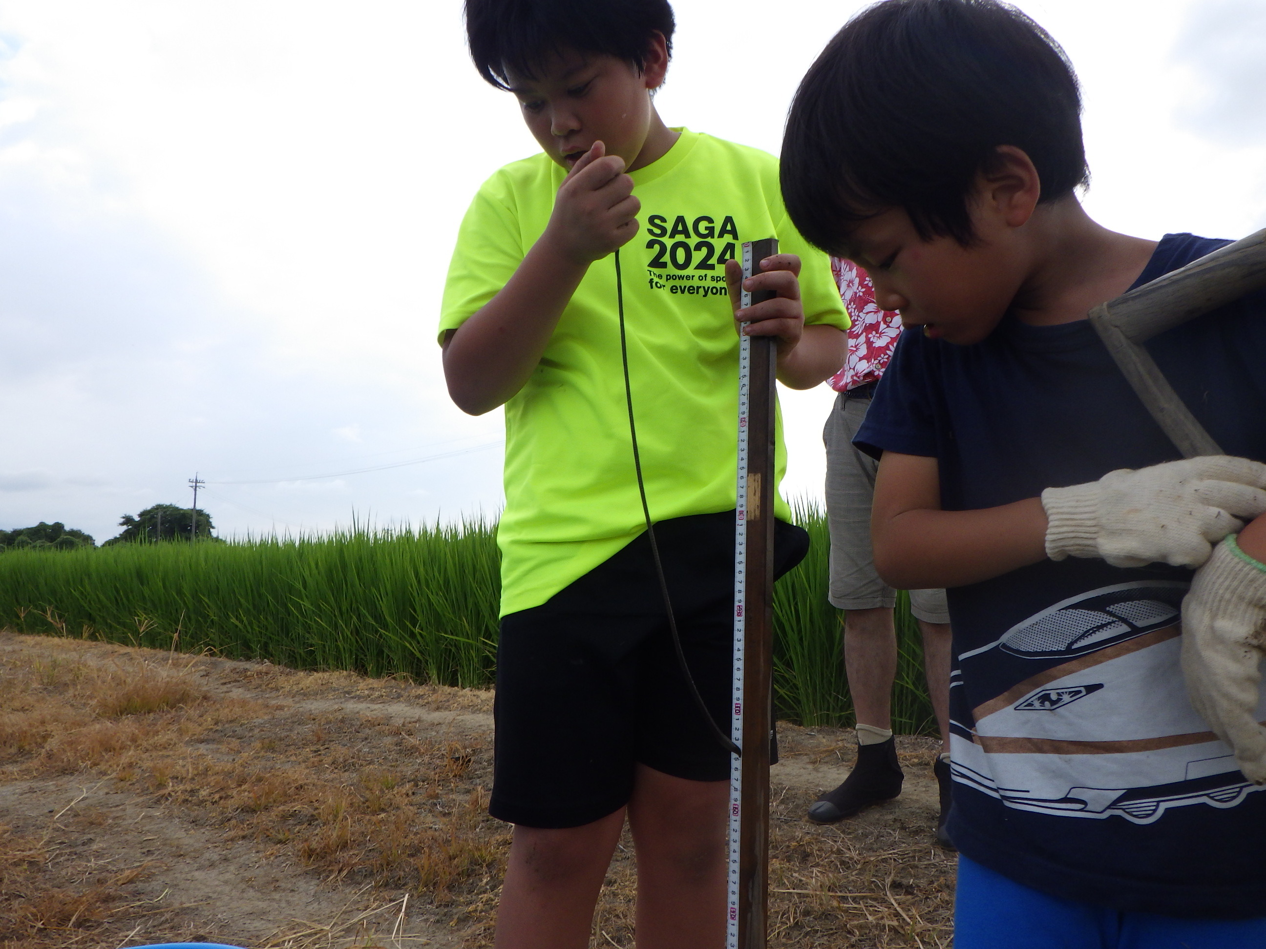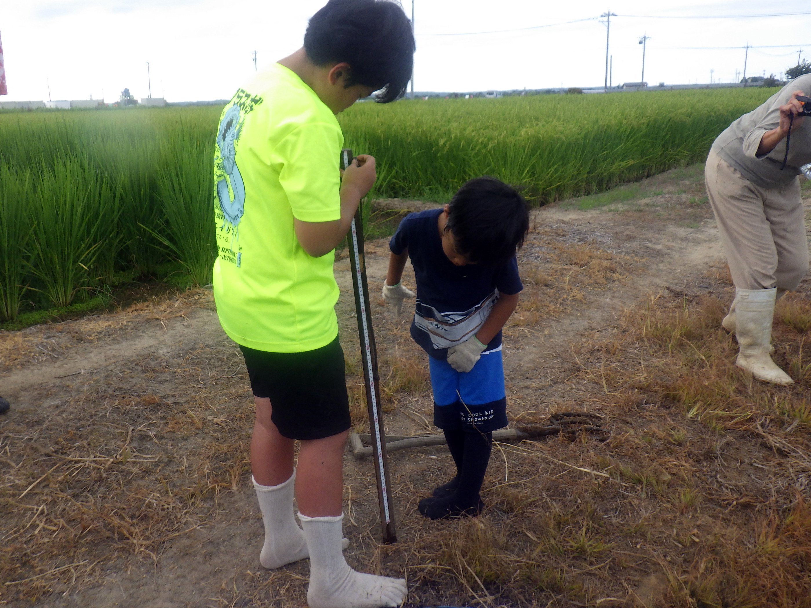 抜き取ったセイタカアワダチソウの長さを競う「セイタカアワダチソウ抜き取り大会」。