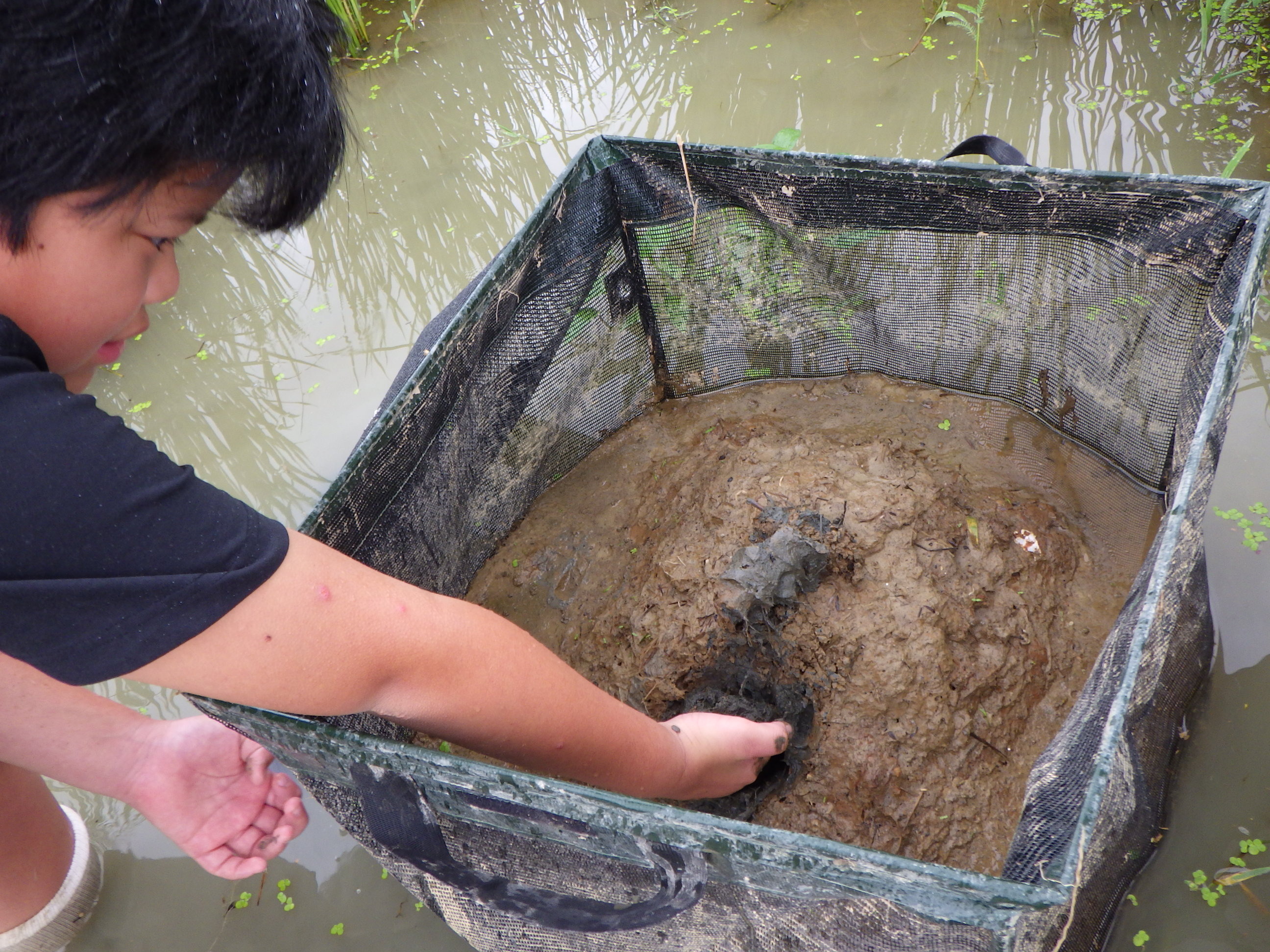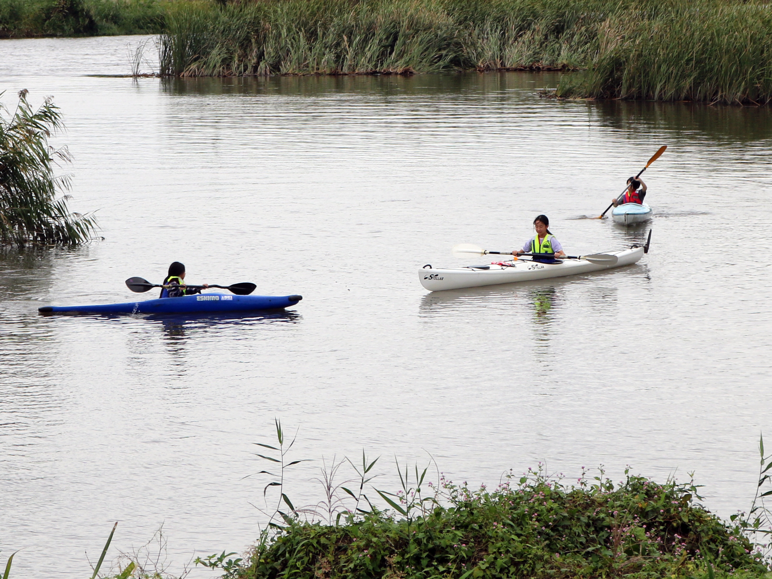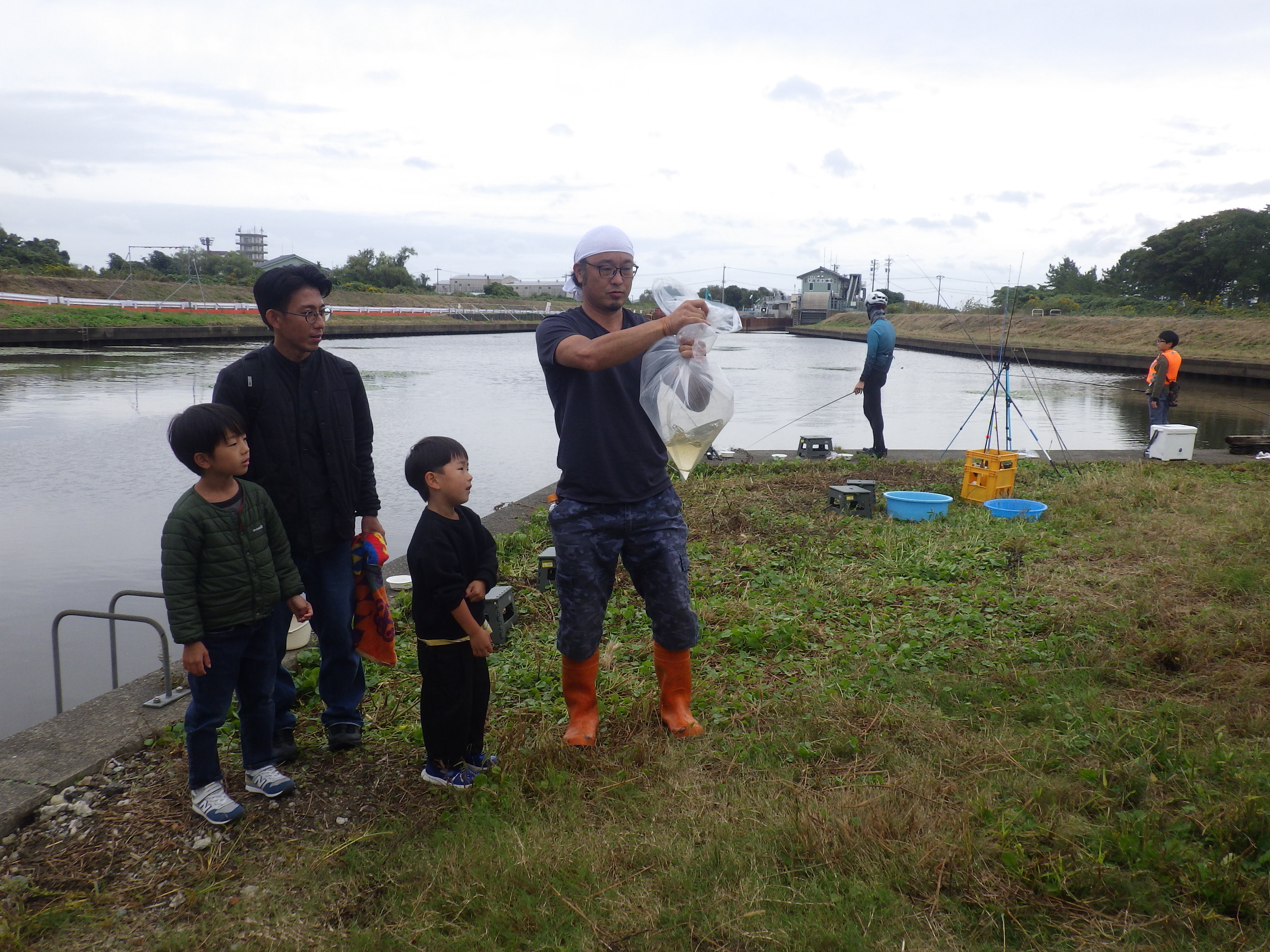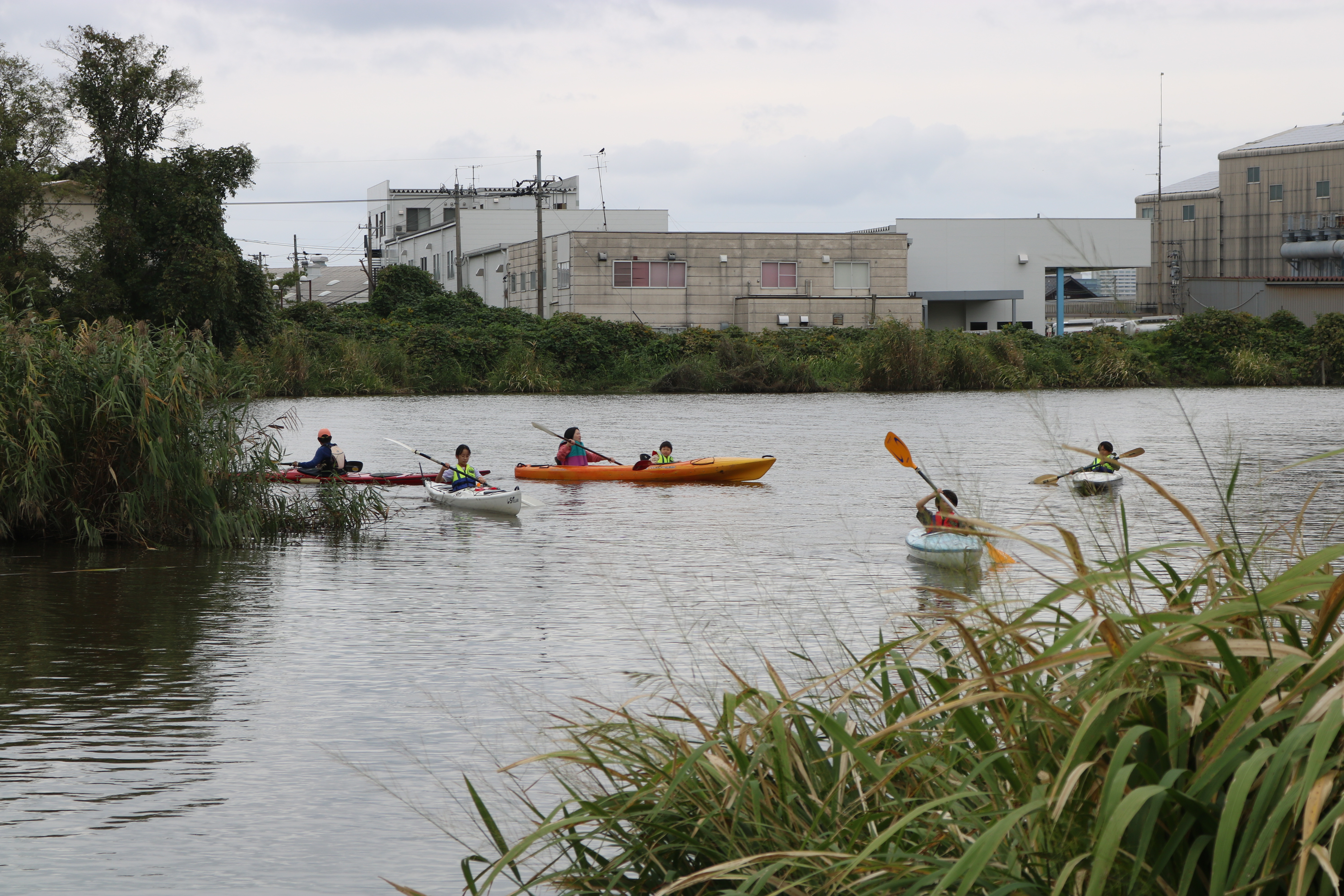 ここは河口に水門があり、流れが無く、ある意味安全になっています。でも小さな子供が川に落ちる危険もあることから救命着を着用いただき実施しました。