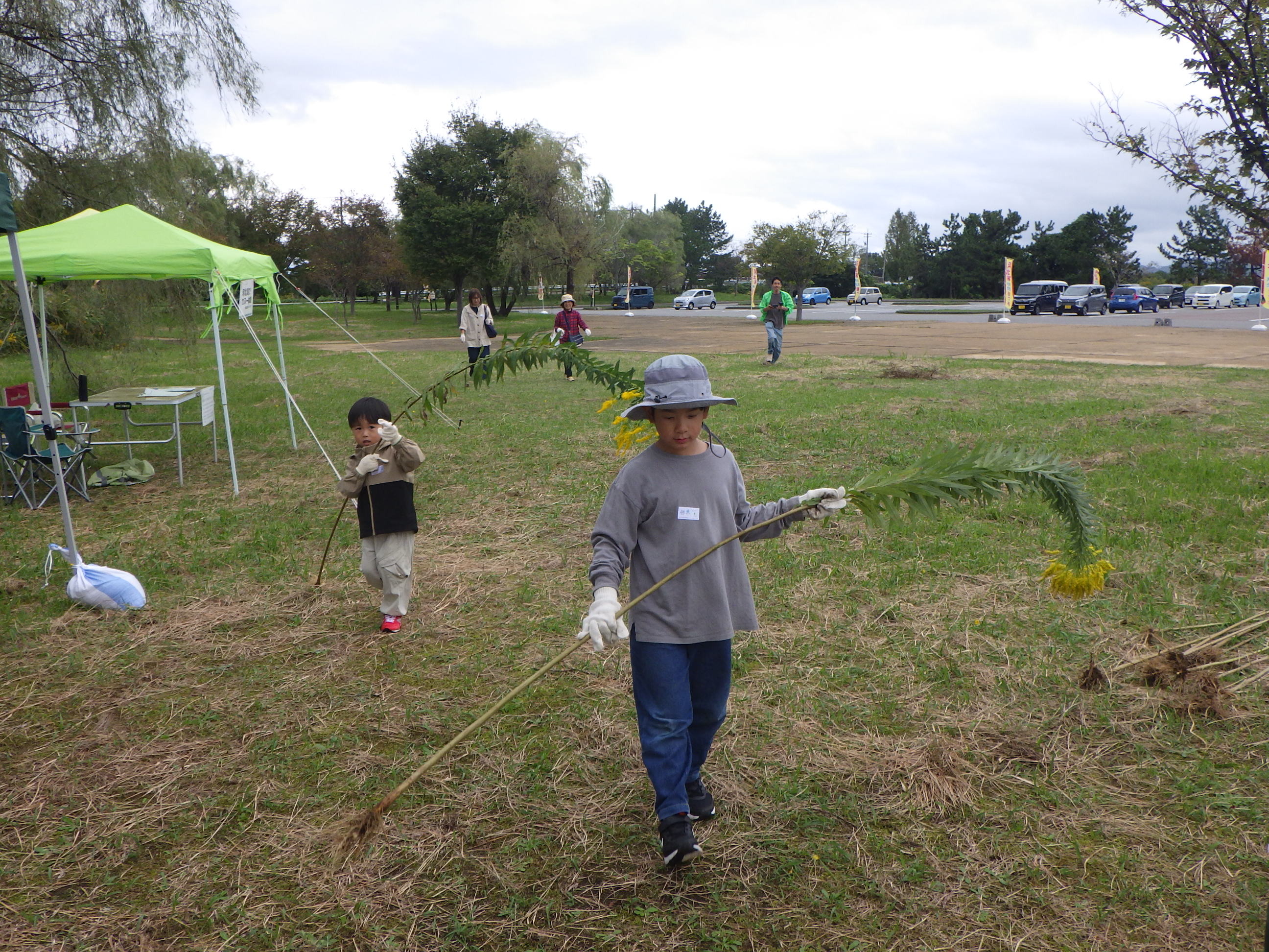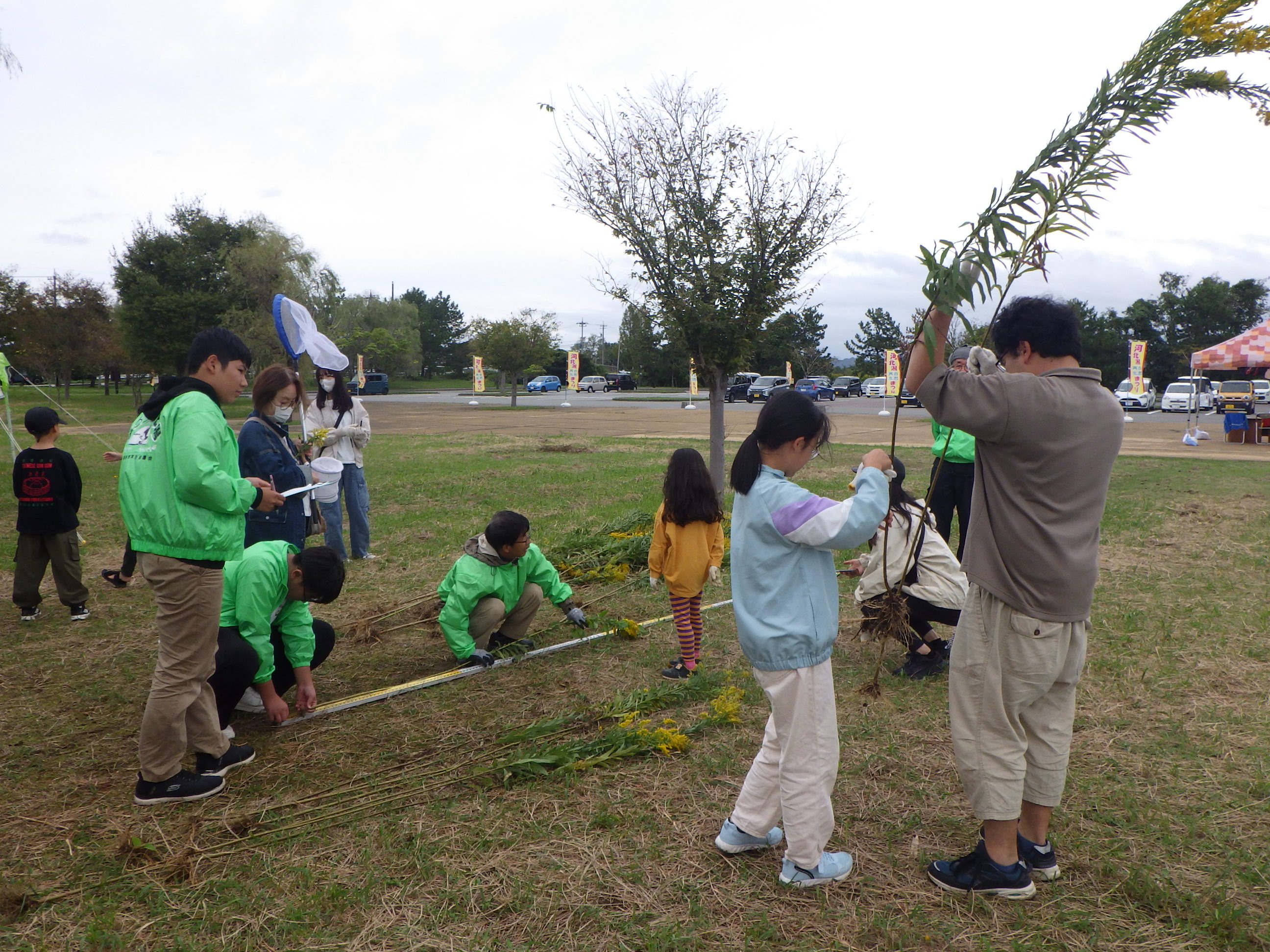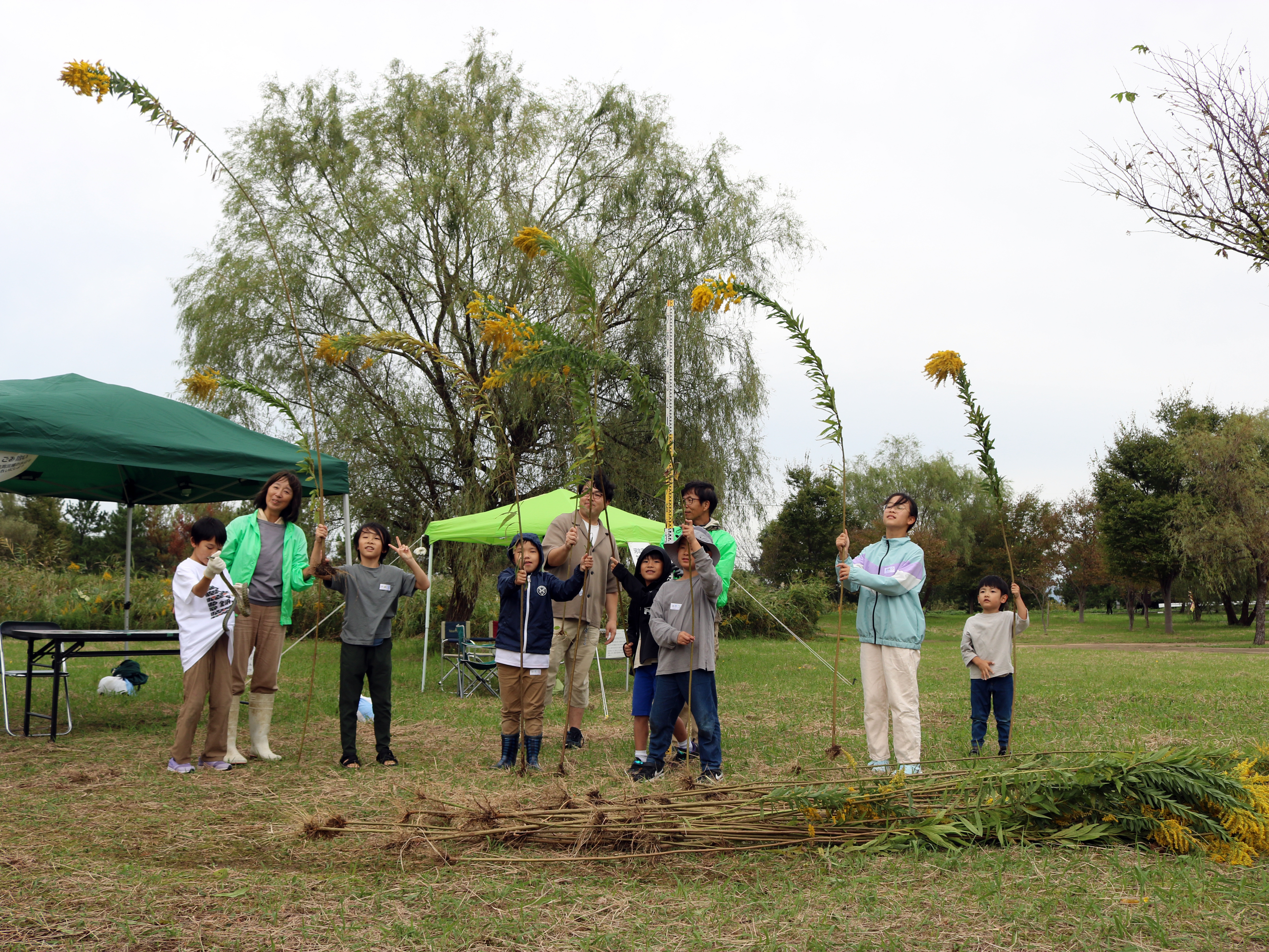 抜き取ったセイタカアワダチソウの長さを競う「セイタカアワダチソウ抜き取り大会」。