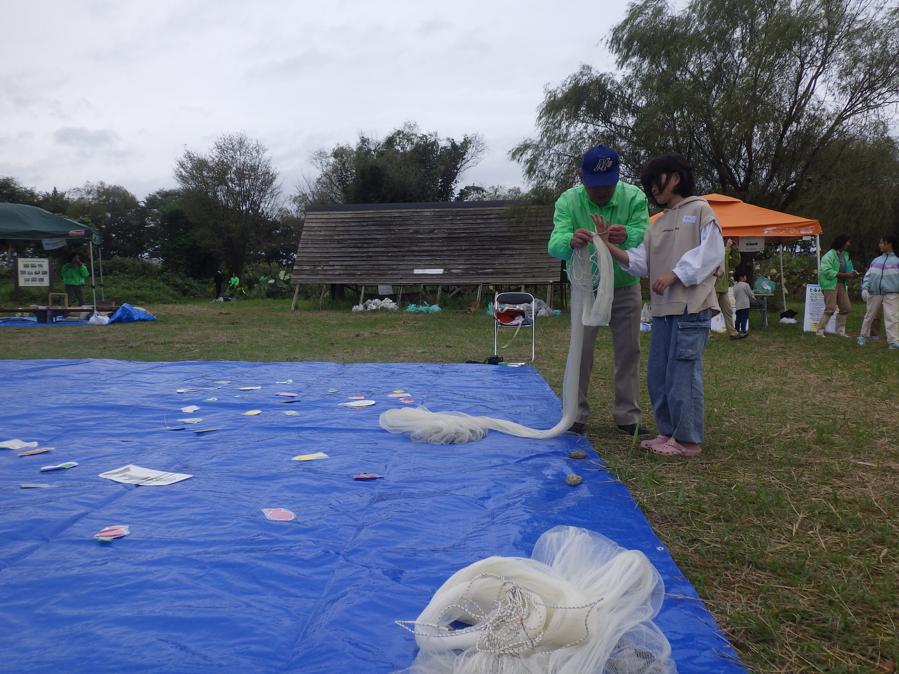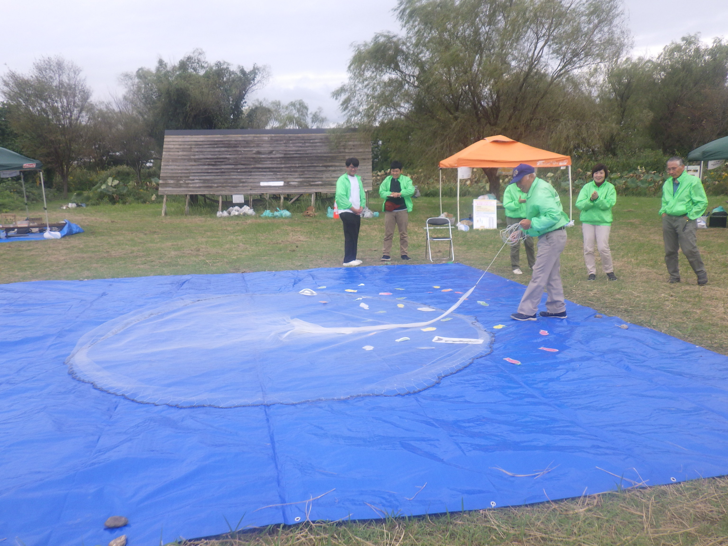 小浦さんに投げ方を教わるこのプログラムは、2020年の河北潟自然再生まつりからはじまりましたが、だんだん網が広がる人が増えてきたように思います。でも、小浦さんの投網は格別に美しく、サラサラサラ・・と網が流れるように広がり、ブルーシートの上に大きく円く広がり落ちるのです。小浦さんが投網を投げると、子供も大人もみんな体験してみたくなります。